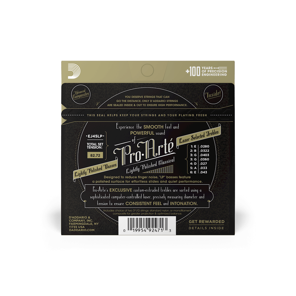 Lightly Polished Composite sets are designed to reduce finger noise, while still providing the sophisticated classical tone Pro-Arté is renowned for. This Lightly Polished set is made with clear nylon trebles and silver-plated copper bass strings, wound over exclusive composite core material, then polished down for effortless slides and quiet performance. Pro-Arté Lightly Polished Composite sets also include an extra composite 3rd/G-string, for increased projection. This Normal Tension set is our best-selling tension, preferred for its balance of rich tone, comfortable feel, and dynamic projection.