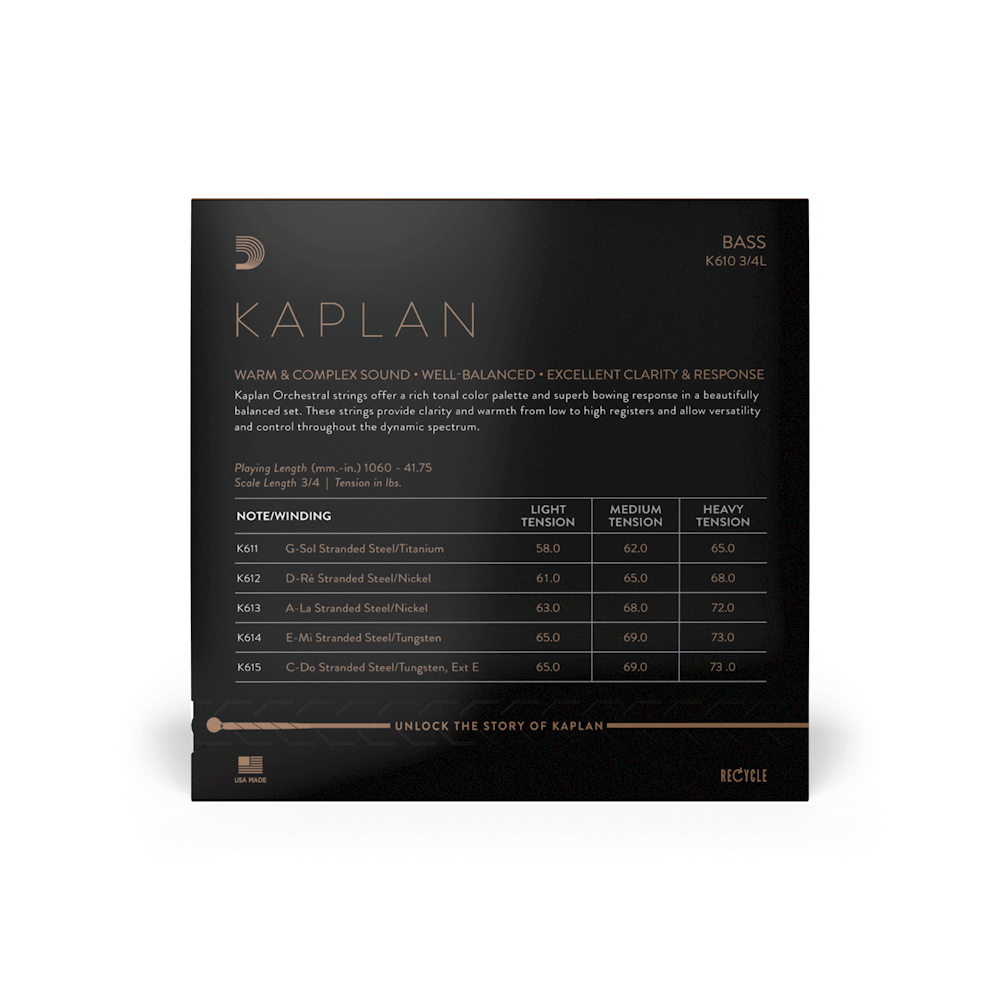 Kaplan strings offer advancing players a suite of options to satisfy their requirements. Kaplan projects powerfully and dynamically while also settling in quickly. Exhibiting a rich tonal palette and superb bow response, Kaplan strings offer a variety of musical opportunities to a range of players.