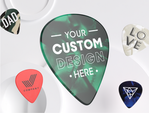 Please note that metallic ink colors on Black Pearl Celluloid, Black Celluloid, and Black Duralin picks may not display as expected. The black base reduces the reflective properties of metallic ink, making some designs difficult to see and QR codes difficult to scan. For more color options, we recommend our full color picks.